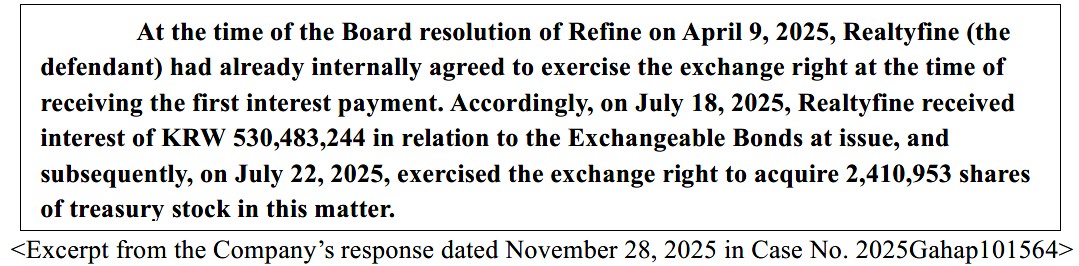 The disclosures in the Company’s semi-annual report (June 2025), quarterly report (September 2025), and annual report (December 2025) do not provide sufficient detail to clearly understand the accounting principles applied. However, when the early exercise of the EB was announced on July 22 last year, both the Company and its controlling shareholder Realtyfine (the EB holder) stated through the media that the decision was made “due to concerns over derivative valuation losses arising from share price increases.”