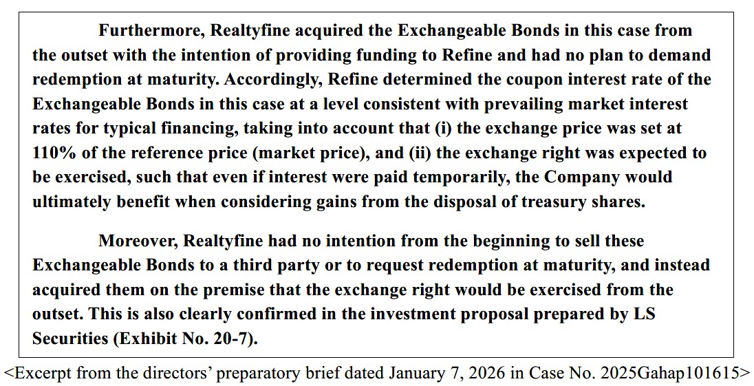 As a shareholder holding approximately 10.21% of Refine Co., Ltd. (the “Company”), we have been actively engaging in various efforts to address concerns regarding shareholder value erosion and governance issues arising from the Exchangeable Bonds (“EB”) resolved for issuance on April 9 of last year, particularly in relation to the new controlling shareholder and management. As part of these ongoing efforts, we would like to publicly express our views and raise questions regarding the agenda for the upcoming general shareholders’ meeting scheduled for March 31, as well as the Company’s FY2025 financial statements disclosed a few days ago.