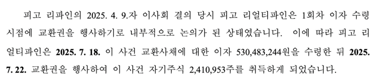 우선, 회사의 반기보고서(25.06), 분기보고서(25.09), 사업보고서(25.12)에 관련된 설명이 자세하지 않아 회계처리 원칙을 명확히 이해하기는 어렵습니다. 하지만, 작년 7월 22일 교환사채를 조기 행사 결정하면서 회사와 회사의 대주주인 리얼티파인(교환사채 소유자)은 언론을 통해 “주가 상승에 의한 파생상품 평가손실에 대한 걱정으로 조기 행사를 결정했다”라고 주장한 바 있습니다.