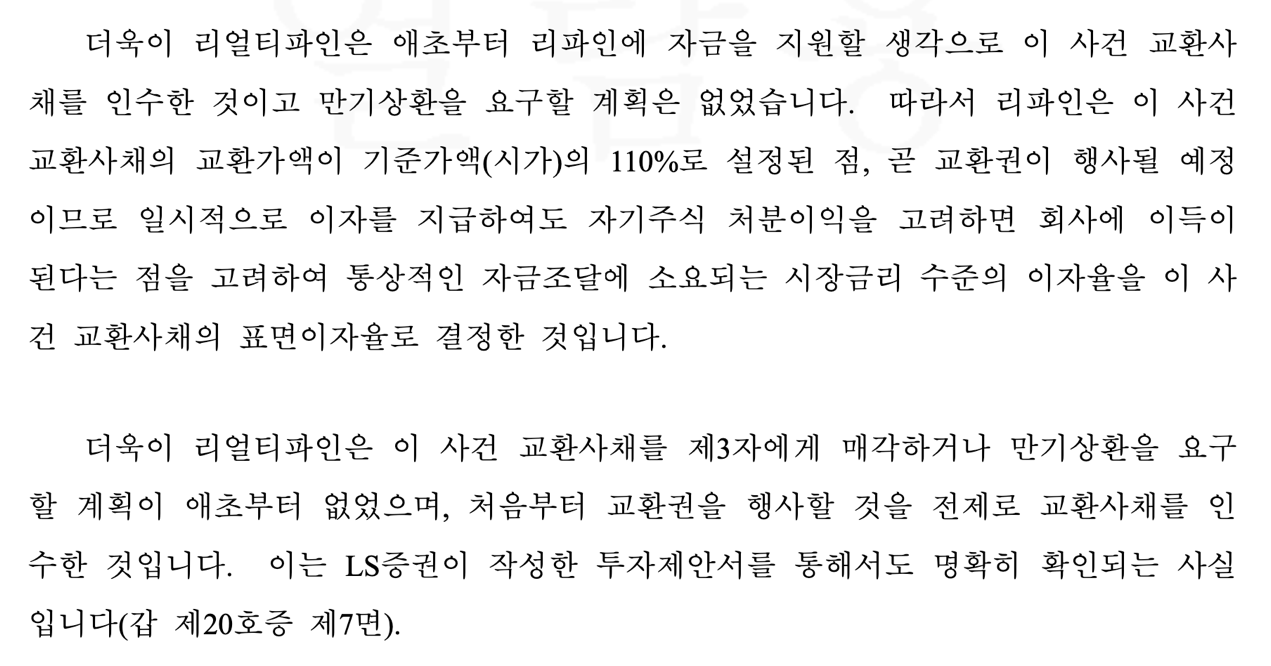 둘째, 당사는 7월 18일 지분공시를 하였고 7월 21일까지 비공개 레터 등으로 회사와 소통하였고 7월 21일에 임시주주총회 주주제안을 하였는데, 대단히 공교롭게도 7월 22일에 문제의 교환사채가 행사 결정되었기 때문입니다.